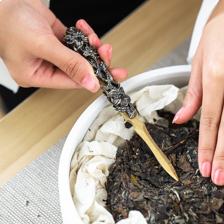 Ніж допомагає акуратно розділити пуер на порції, не кришачи листя та не порушуючи структуру сировини. Підходить для роботи з шу та шен пуером різної щільності пресування.