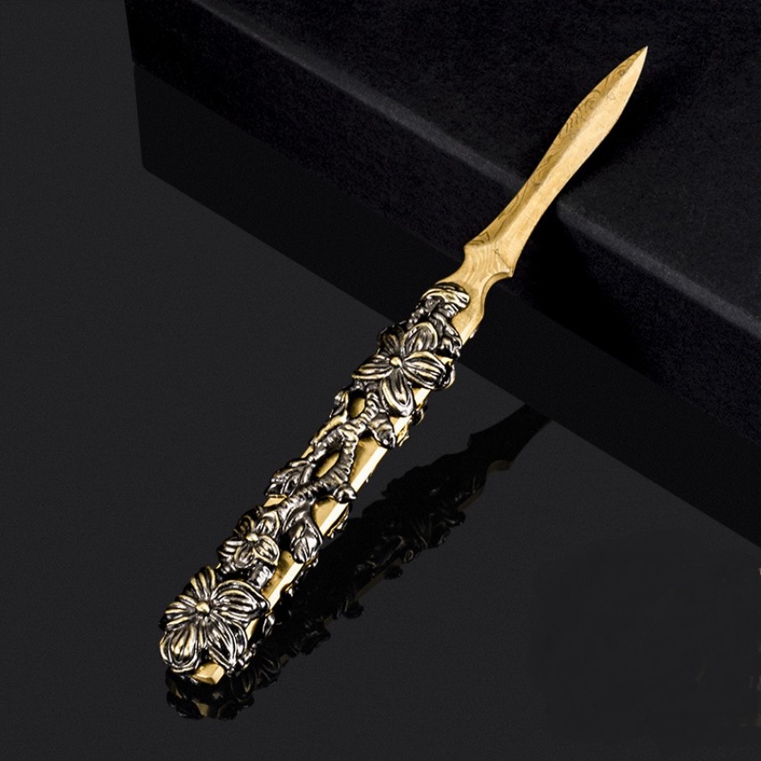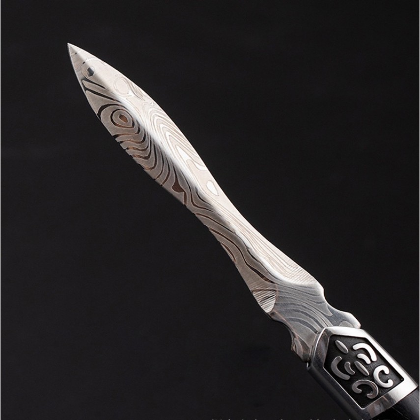 Клинок виготовлений із нержавіючої сталі з декоративним візерунком, що імітує дамаську сталь. Малюнок нанесений методом лазерного гравіювання, що надає лезу благородного вигляду та підкреслює його характер. Вузька форма клинка забезпечує легке проникнення в щільну пресовку без зайвого кришіння.
