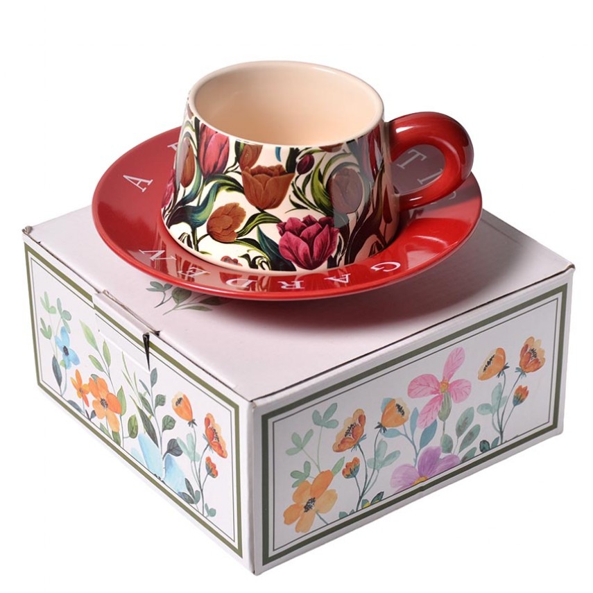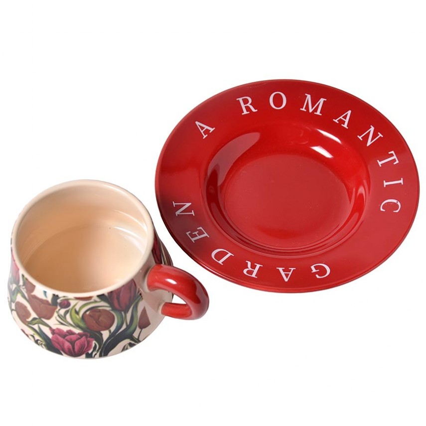 Колір блюдця — насичений червоний із написом “A Romantic Garden”