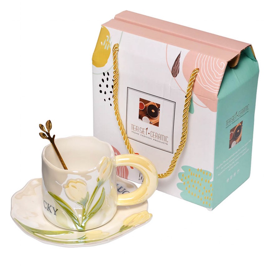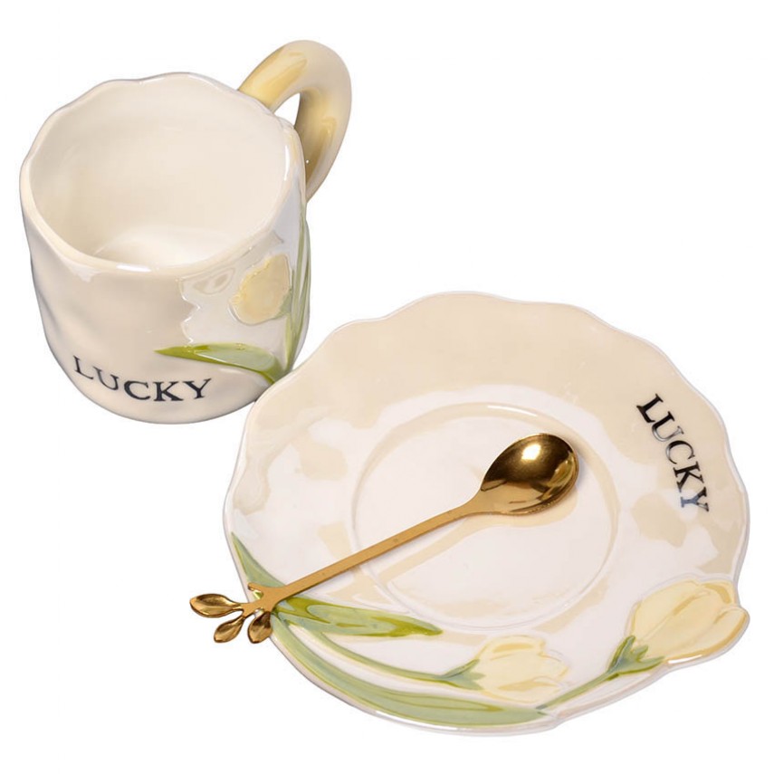 Ця витончена чайна пара дарує настрій сонячного ранку та легкості. Білосніжна керамічна чашка прикрашена рельєфним тюльпаном, пелюстки якого, як і ручка, виконані у ніжному жовтому відтінку — кольорі тепла, радості й весняної свіжості.