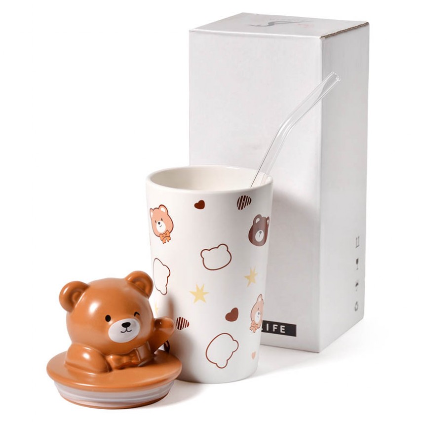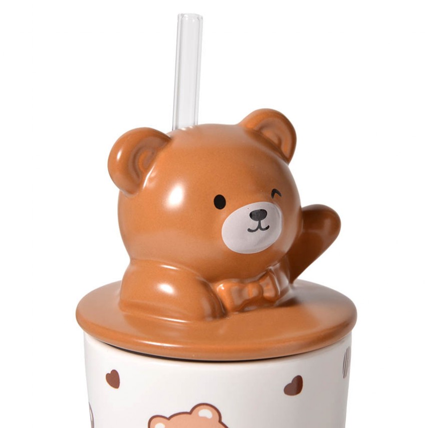 Керамічна чашка-склянка "Веселий Ведмедик - 3" з кришкою та трубочкою, 400 мл