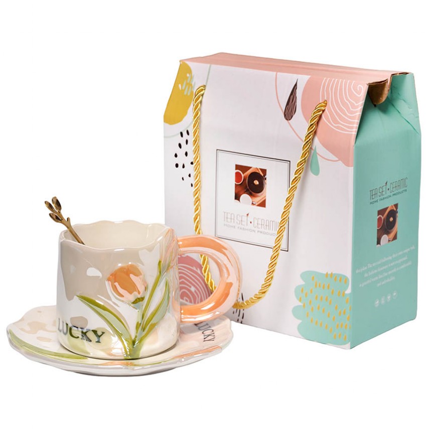 Светлая, тёплая и утончённая — эта чайная пара будто создана для уютных солнечных утр. Белая керамическая чашка оформлена рельефным декором тюльпана, лепестки которого, как и изящная ручка, окрашены в нежный светло-оранжевый оттенок, напоминающий апельсиновый рассвет.