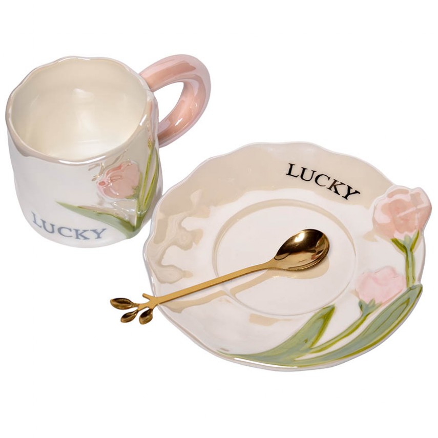 В комплект входит блюдце, выполненное в том же стиле, которое идеально дополняет образ. А финальный штрих — изящная металлическая ложка, завершённая декоративным элементом в виде веточки с листиками, словно собранная прямо из природы.