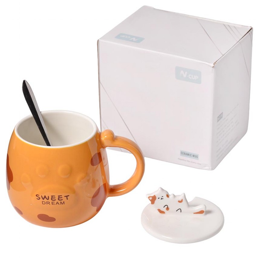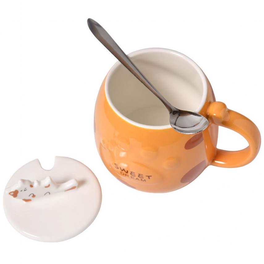 На крышке — миниатюрная керамическая фигурка игривого котика, которая будто выглядывает, охраняя ваше утреннее настроение. В комплекте — металлическая ложка, подходящая для чая, кофе, какао или десертов.