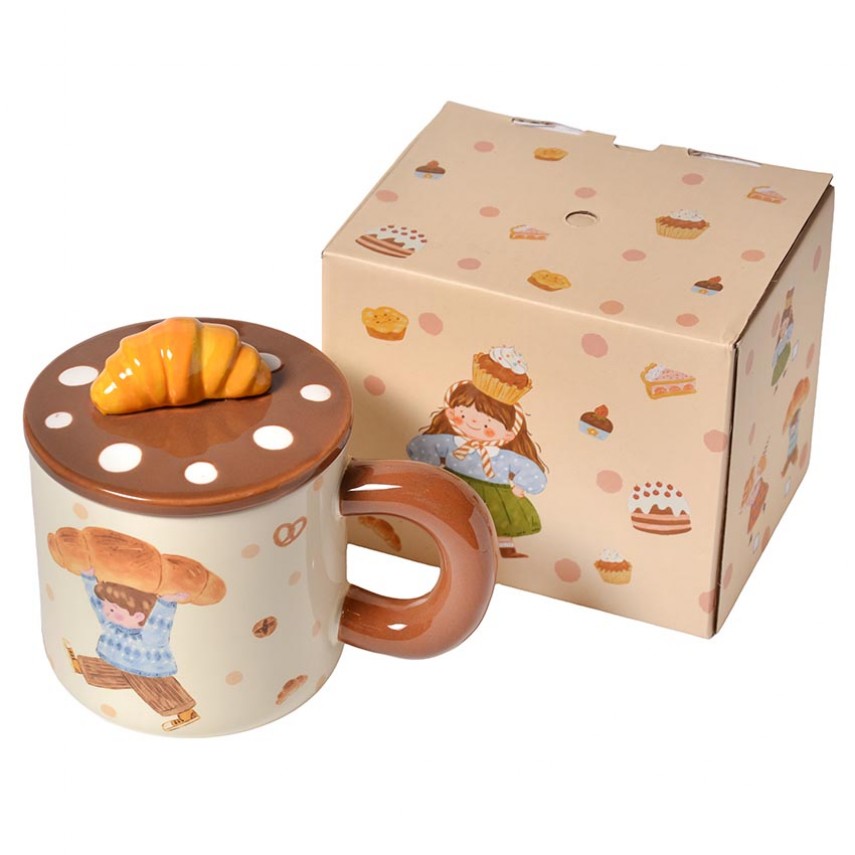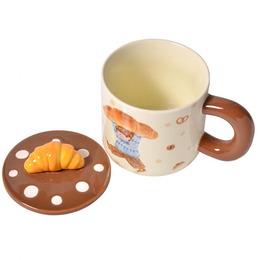 Главная изюминка — объёмный декор на крышке в виде румяного круассана, словно только что вынутого из духовки. Такая чашка идеально подойдёт для ароматного кофе с молоком, горячего шоколада или утреннего чая.