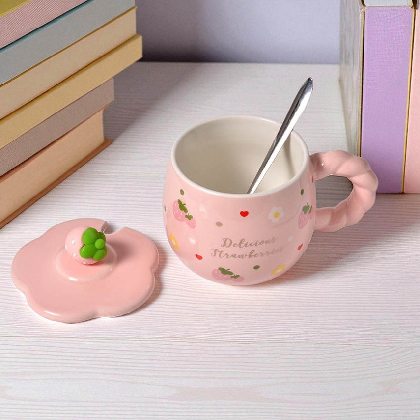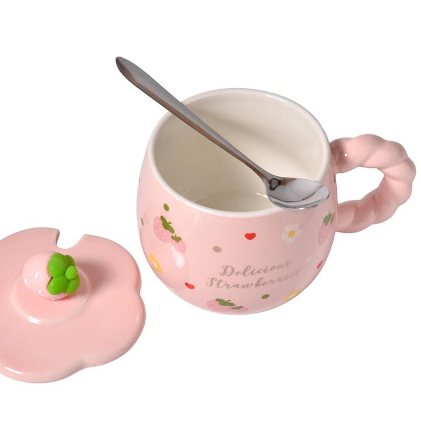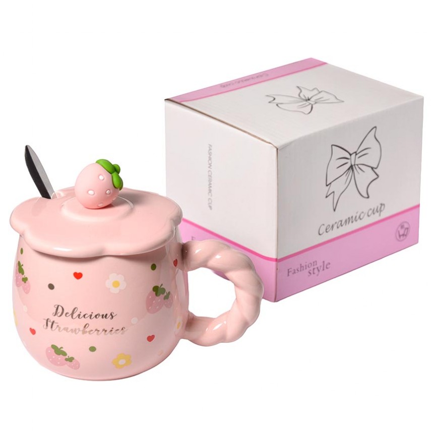 Особое внимание привлекает объёмный декор клубники на крышке, выполненный с любовью к деталям. А ручка в форме плетёного жгута не только необычна визуально, но и удобна в использовании. В комплекте — изящная металлическая ложка, идеально подходящая для чая, кофе или десерта.