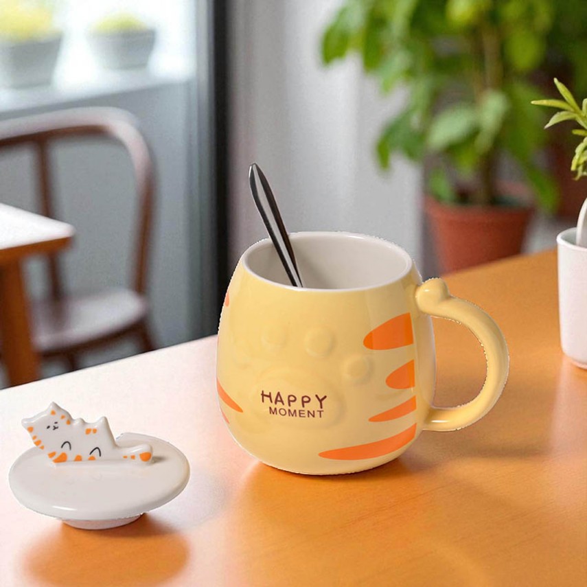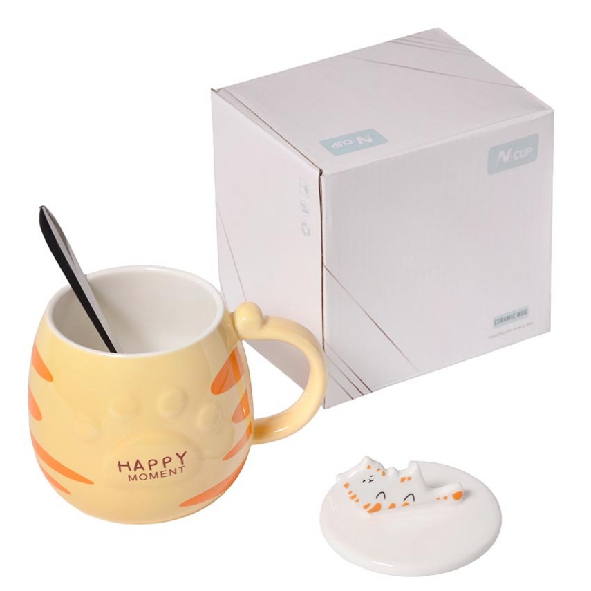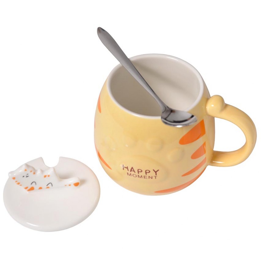 На крышке — объёмная керамическая фигурка игривого котика. Этот трогательный элемент делает чашку не просто посудой, а настоящим настроением. В комплект входит металлическая ложка, которая гармонично завершает образ.