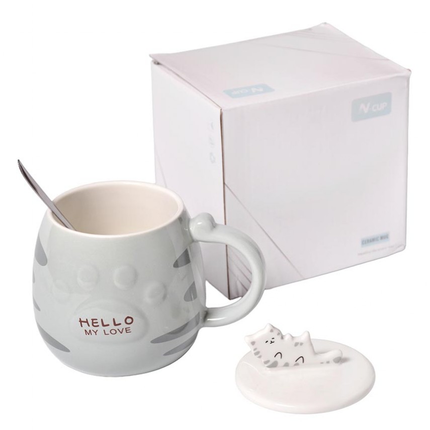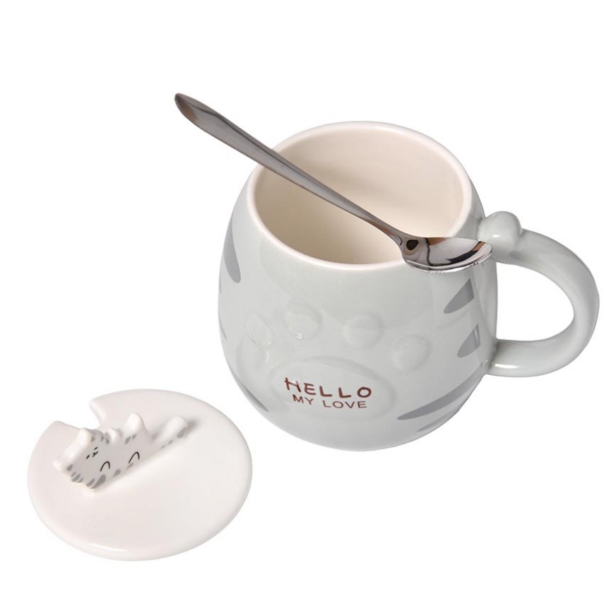 Особый акцент — крышка с керамической фигуркой игривого котика, которая придаёт изделию неповторимый характер и вызывает улыбку с первого взгляда. В комплект входит металлическая ложка, идеально подходящая для чая, кофе или какао.