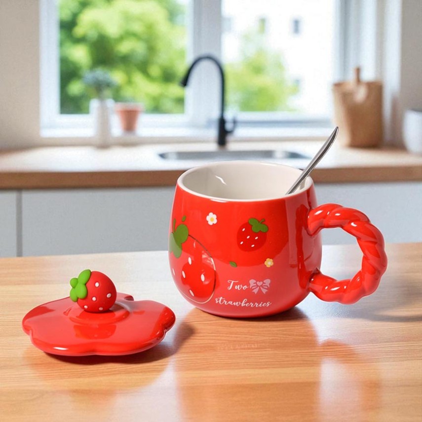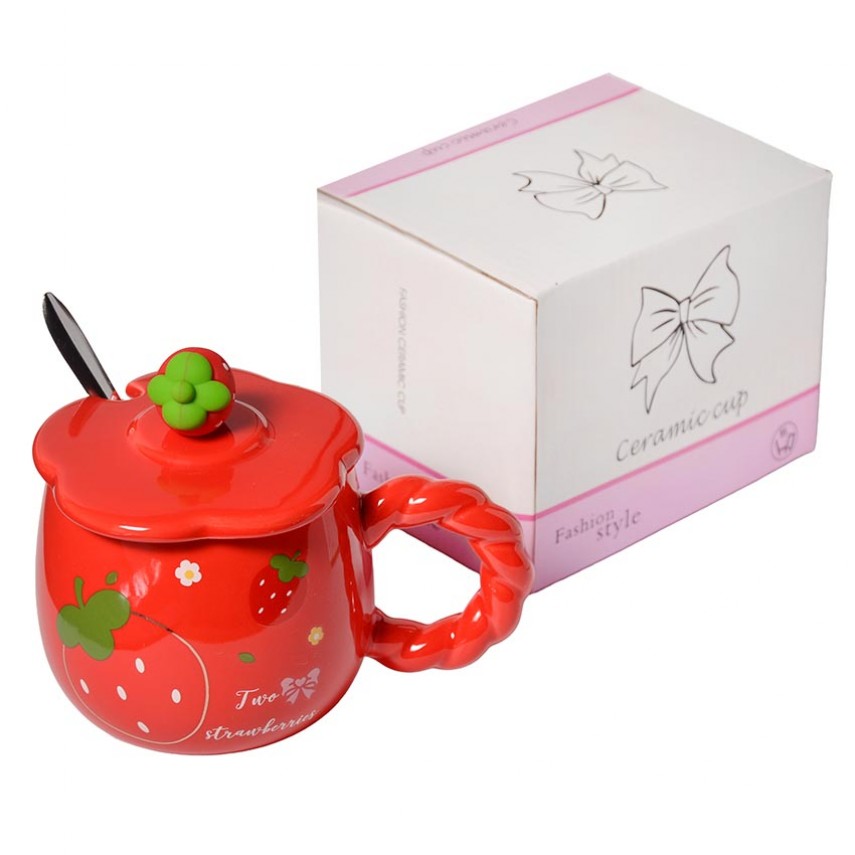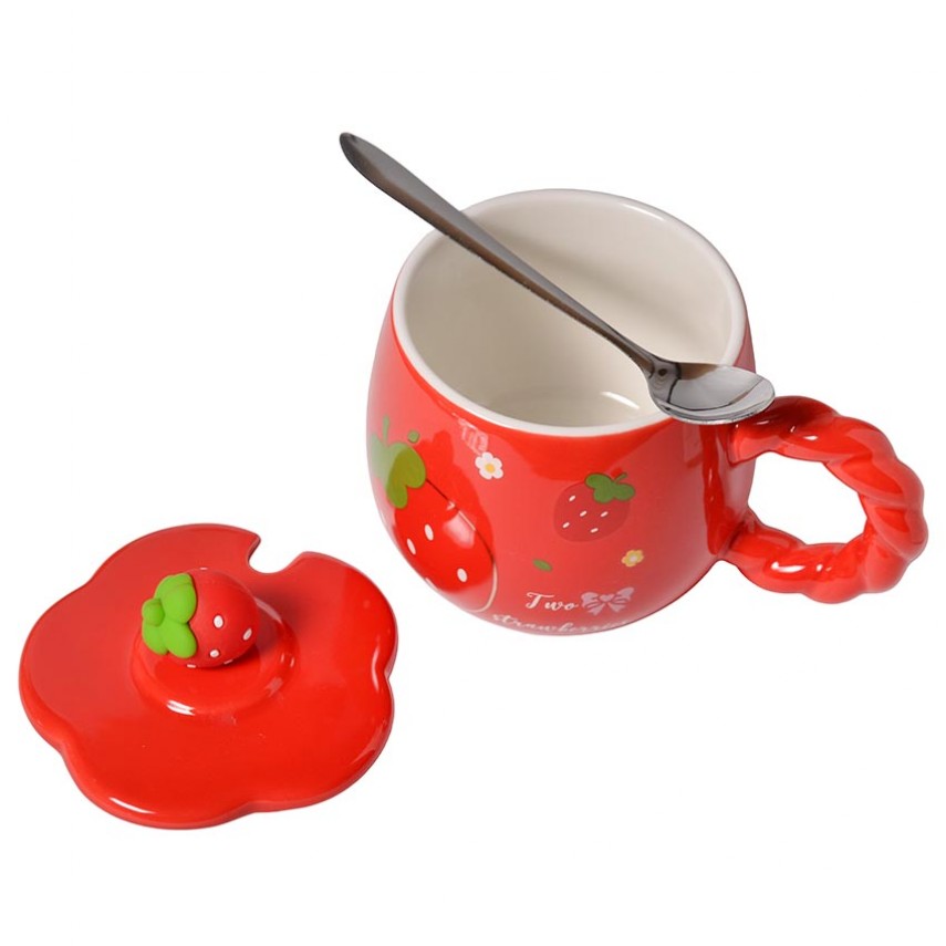 Особое внимание привлекает декор на крышке в виде объёмной клубнички, который добавляет изделию очарования и индивидуальности. А ручка в форме изящного фигурного жгута делает чашку не только удобной, но и визуально интересной.