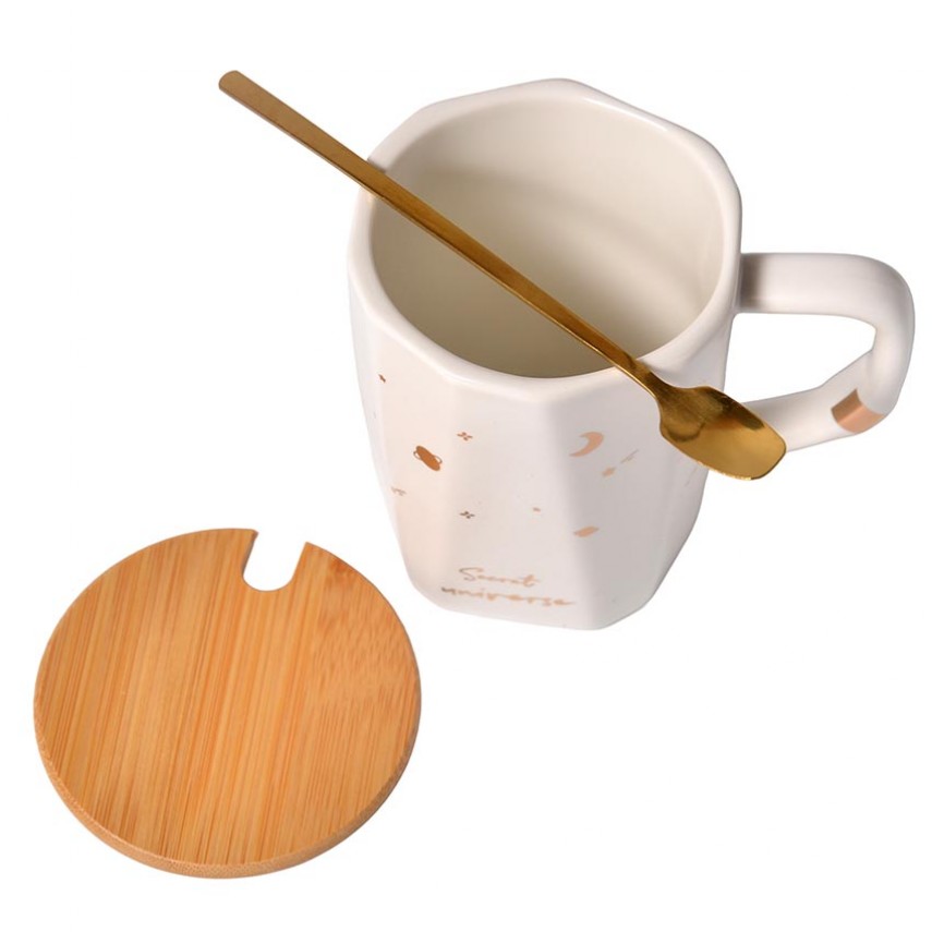 Бамбуковая крышка добавляет тёплый природный акцент и помогает сохранять температуру напитка. В комплект входит металлическая ложка — удобно и стильно.
